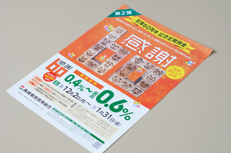 チラシとのぼりの制作事例をお伝えした長崎県民信用組合(けんみん)様の60周年記念商品「感謝60」ですが、販売より早々に完売したとのこと。本当かウソかわかりませんが「チラシの効果があったよ!」と担当の部長からもおっしゃっていただき、とても嬉しいです。なんでも予約販売がかなりの割合を占めたそうで、早速第2弾という運びとなりました。