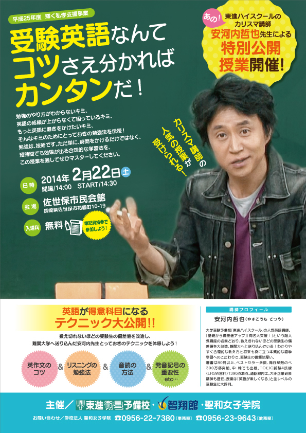 2014.01.31多数の東大合格者を輩出する東進ハイスクールのカリスマ講師、安河内哲也先生の特別公開授業「受験英語なんてコツさえ分かればカンタンだ!」のチラシとポスターを制作しました。