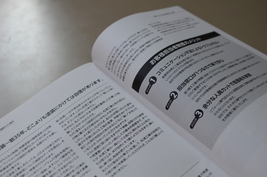 先日、チラシ制作やロゴマーク制作をご案内した外壁塗装・屋根塗装の専門店まつうら工業様の冊子資料です。